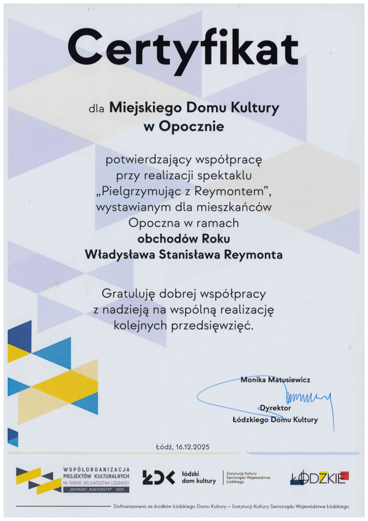 Miejski Dom Kultury otrzymał certyfikat w związku z współpracą przy realizacji spektaklu ,,Pielgrzymując z Reymontem".