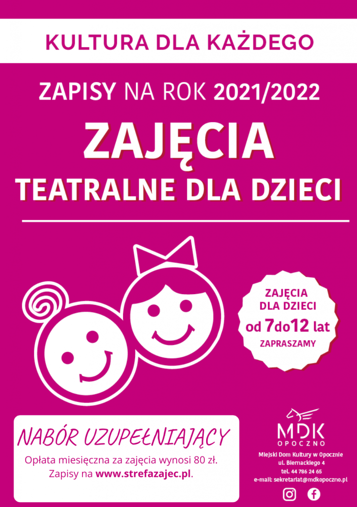Miejski Dom Kultury ogłasza nabór uzupełniający na zajęcia teatralne dla dzieci w wieku od 7 do 12 lat. Sekcję prowadzi Kinga Ilgner - absolwentka Akademii Teatralnej w Warszawie, aktorka filmowa i teatralna, związana z warszawskim Teatrem Narodowym.