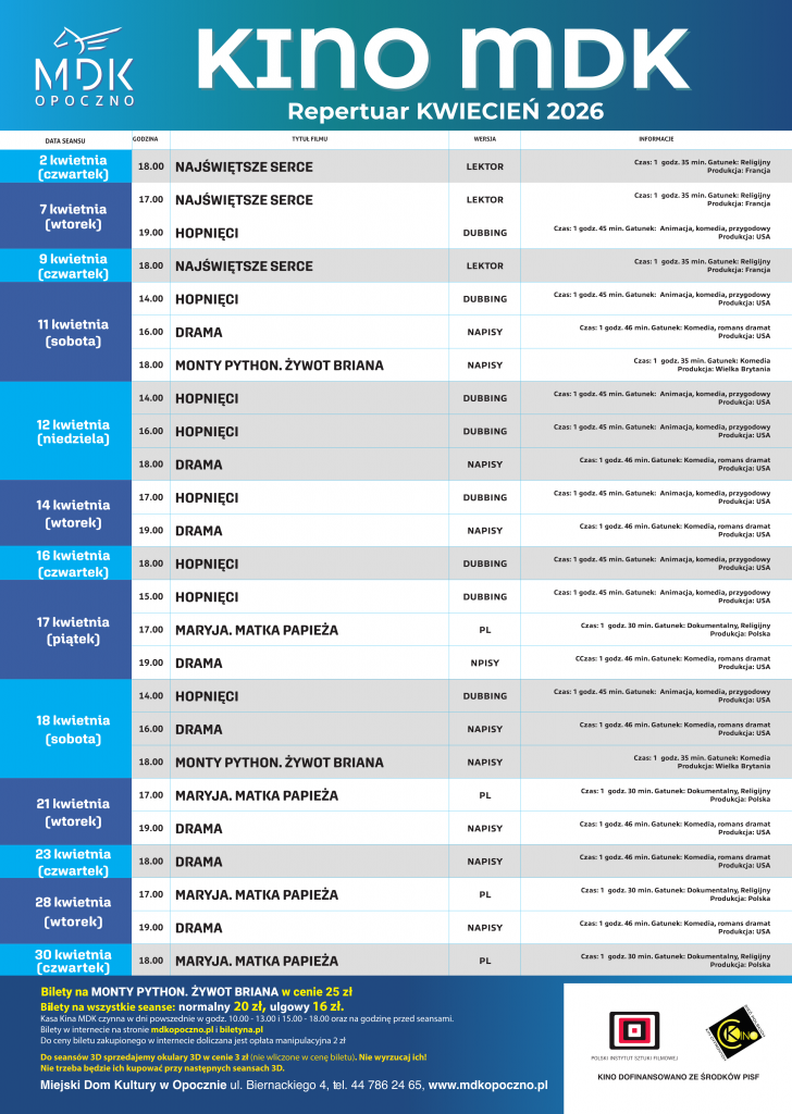 Bilety na wszystkie seanse: normalny 20 zł, ulgowy 16 zł. Kasa KINA MDK czynna w dni powszednie w godz. 10.00-13.00 i 15.00-18.00 oraz na godzinę przed seansami. Bilety w Internecie na stronie: www.mdkopoczno.pl i www.biletyna.pl. Do ceny zakupionego w Internecie doliczana jest opłata manipulacyjna 2 zł.